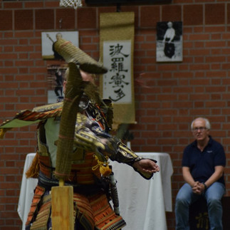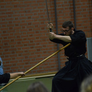 Den dritten Abschnitt bildete ein kurzer Einblick in das Waffentraining durch Formen mit dem japanischen Schwert (Katana und Tachi), dem Speer (Yari), der Hellebarde (Naginata) sowie kurzen und langen Stöcken (Hanbo und Bo).